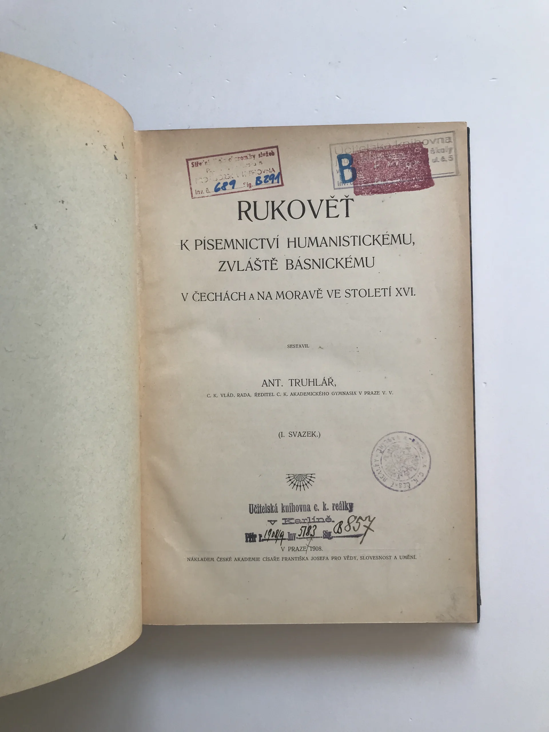 Rukověť k písemnictví humanistickému, zvláště básnickému v Čechách a na Moravě ve století XVI. (I. svazek), Antonín Truhlář